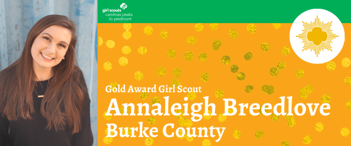 Girl Scouts Carolinas Peaks to Piedmont is pleased to announce that Annaleigh Breedlove, Morganton, has earned her Girl Scout Gold Award, the highest award in Girl Scouting. Breedlove, daughter of Keith and Karen Breedlove and a member of Girl Scout Troop 10139, built a removable greenhouse to fit over an existing raised bed at her … Continue reading Annaleigh Breedlove Earns Girl Scouts Highest Honor