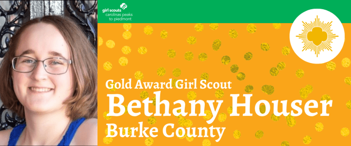 Girl Scouts Carolinas Peaks to Piedmont is pleased to announce that Bethany Houser, Morganton, has earned her Girl Scout Gold Award, the highest award in Girl Scouting. Houser, daughter of Mark and Sherry Houser and a member of Girl Scout Troop 12948, established a special needs children’s ministry at her church, Summit Community. She created … Continue reading Bethany Houser Earns Girl Scouts Highest Honor