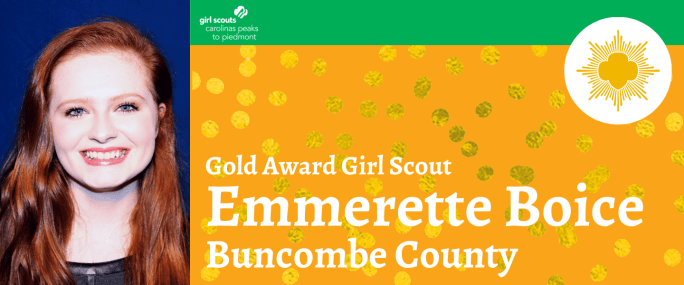 Girl Scouts Carolinas Peaks to Piedmont is pleased to announce that Emmerette Boice, Asheville, has earned her Girl Scout Gold Award, the highest award in Girl Scouting. Boice, daughter of Darren and Jennifer Boice and a member of Girl Scout Troop 30513, created a self-confident focused warm-up routine for a middle school drama class. She … Continue reading Emmerette Boice Earns Girl Scouts Highest Honor