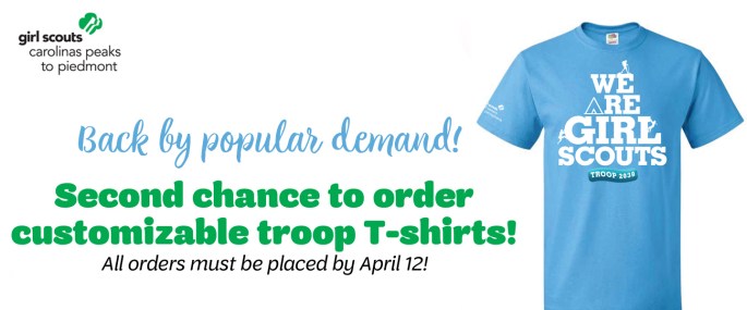 Did your troop miss out on the opportunity to order customizable troop T-shirts in the fall? Well they are back! T-shirt orders can be placed now through April 12. Pre-orders must be paid in advanced. For more information and the order form, please click here.