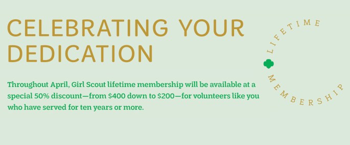 Have you given 10+ years of service to Girl Scouts? We want to thank you for your dedication with this special Lifetime Membership offer that runs through April. If you have questions, feel free to reach out to us at info@girlscoutsp2p.org or 800-672-2148.