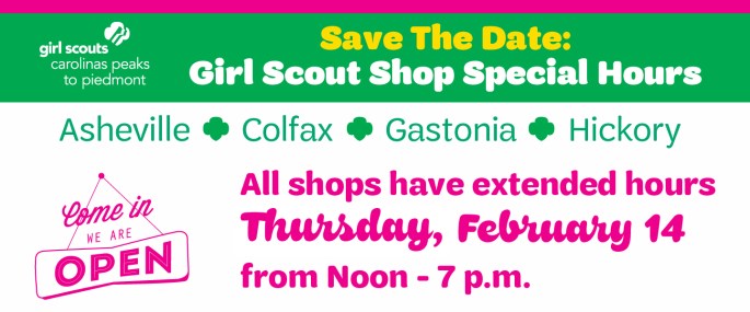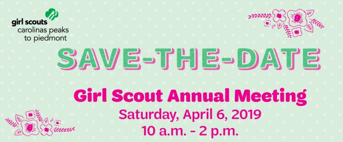 Our 2019 Annual Meeting will take place on Saturday, April 6 at the J.E. Broyhill Civic Center in Lenoir from 10 a.m.- 2 p.m. The day will include a keynote speaker, girl-led presentations, interactive displays, council business and lunch. To be a registered voting member, you must be a currently registered Girl Scout, 14 years … Continue reading Save-the-Date: 2019 Annual Meeting