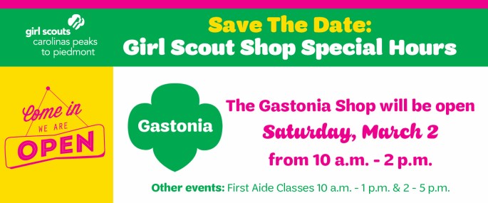 Stock up on Girl Scout gear during the Gastonia Shop's Saturday hours. Pre-register for the First Aid Classes here. Can't make it to the shop? You can place your order online!