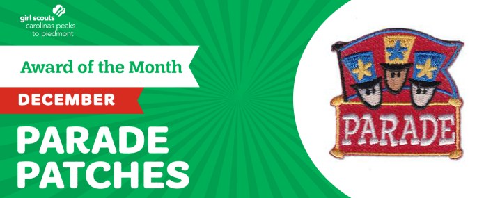 Has your troop participated in a holiday parade this year? Celebrate the fun of the season and pick up your Holiday Parade fun patches in the council shop. Patch designs may vary from shop to shop or you can order your own! Plus, don't forget about the limited-edition patch featuring the Girl Scout float from … Continue reading December Award of the Month