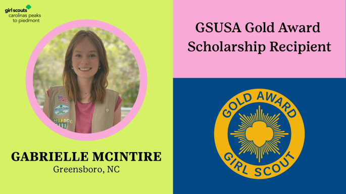 Gabrielle McIntyre of Guilford County and a member of Girl Scout Troop 2483 with Girl Scouts Carolinas Peaks to Piedmont (GSCP2P) has been selected as a National Gold Award Scholarship recipient from Girl Scouts of the USA (GSUSA). The GSUSA Gold Award Scholarship recognizes one outstanding Gold Award Girl Scout from each of the 111 … Continue reading Local Girl Scout Wins National Scholarship